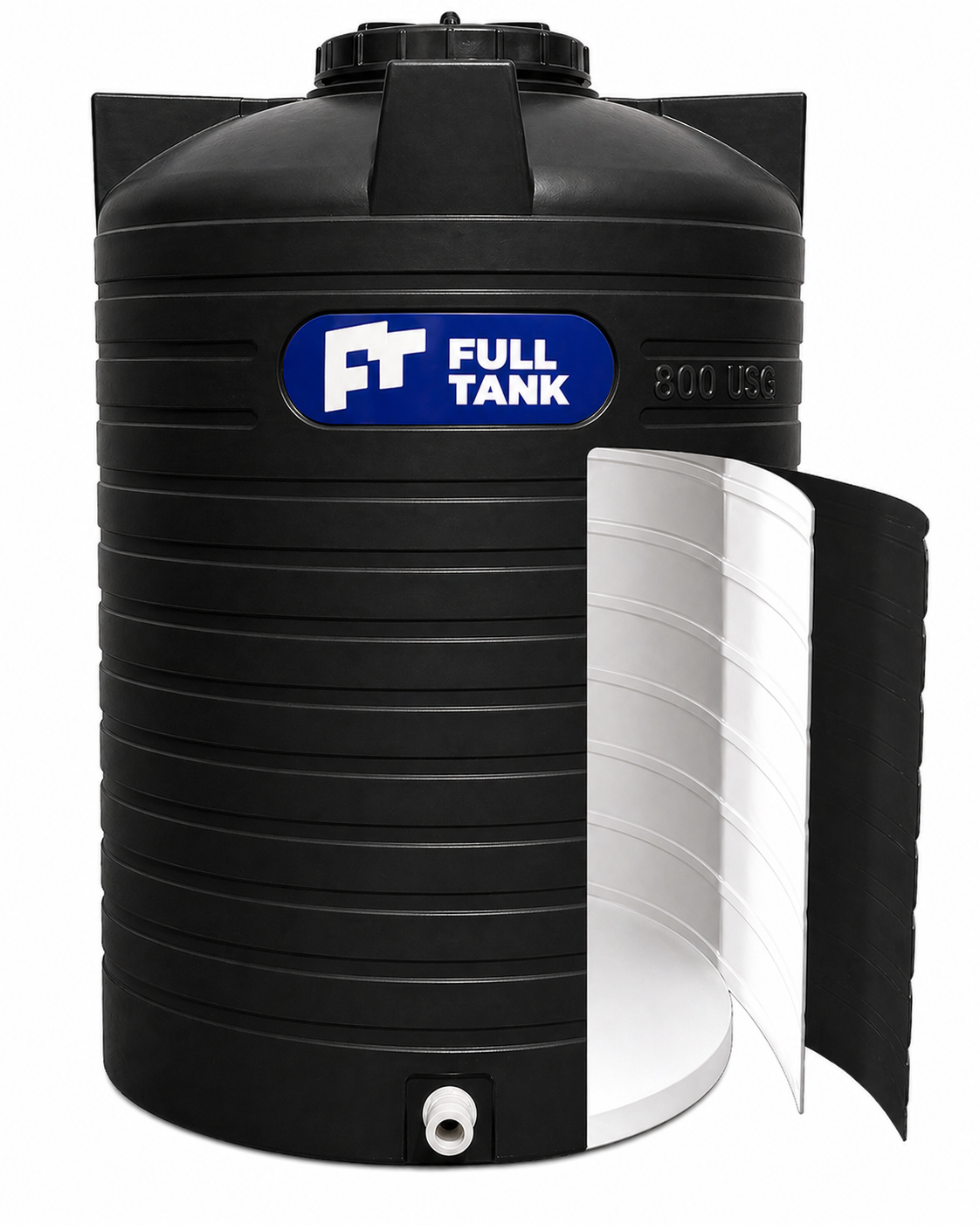 Full Tank products are manufactured using industrial rotational molding (rotomoulding). Raw polyethylene resin is loaded into a mold, which is then heated and rotated on two axes simultaneously. As it spins, the melted plastic coats the interior walls evenly, producing a seamless, one-piece container with no welds or joints.